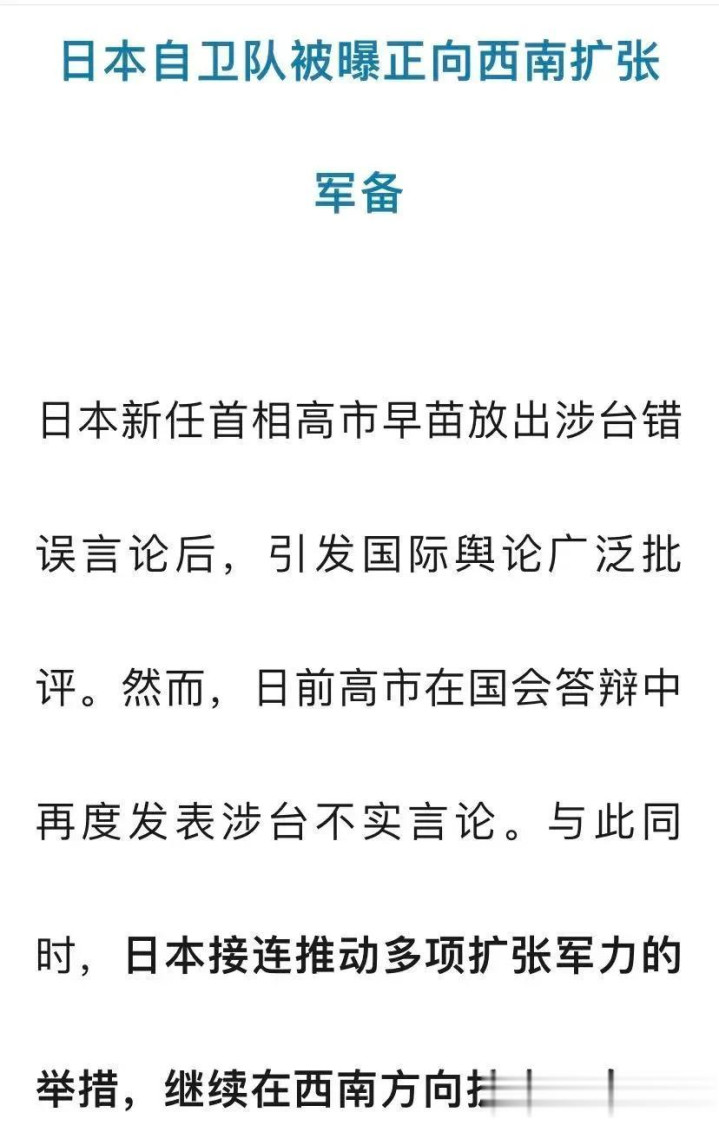 作为掌握日本自卫队最高指挥权的政治核心,高市早苗的言行绝非个人表态,而是关乎地区安全的危险信号。她妄称“台湾有事可能构成日本存亡危机事态”,企图将中国内政与日本安全捆绑,本质是对一个中国原则的公然践踏,更是对《中日联合声明》精神的彻底背弃。面对中日各方的严正抗议和日本国内的理性呼声,她始终以“立场未变”敷衍搪塞,回避核心问题,暴露其“以台制华”的真实图谋。